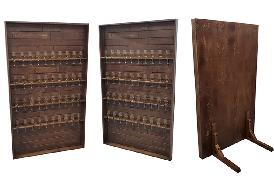 These unique walls are handcrafted with real wood. We have 5 available for rent: 2 white-washed wood, and 3 rustic wood walls. Each wall holds 40 Champagne Flutes.